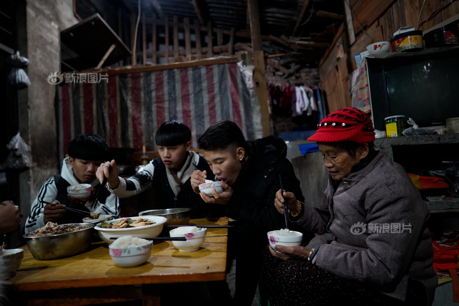 晚上八点,在韦玉琴家里还有一场直播。直播前,韦玉琴与阿龙的小伙伴们在家吃晚饭。由于拍段子并不能带来直接的经济收入,阿龙开始组建起一个松散的直播团队,主要依靠直播礼物打赏来挣钱,“当然,在直播中网友想看的主要还是奶奶。”阿龙坦言。