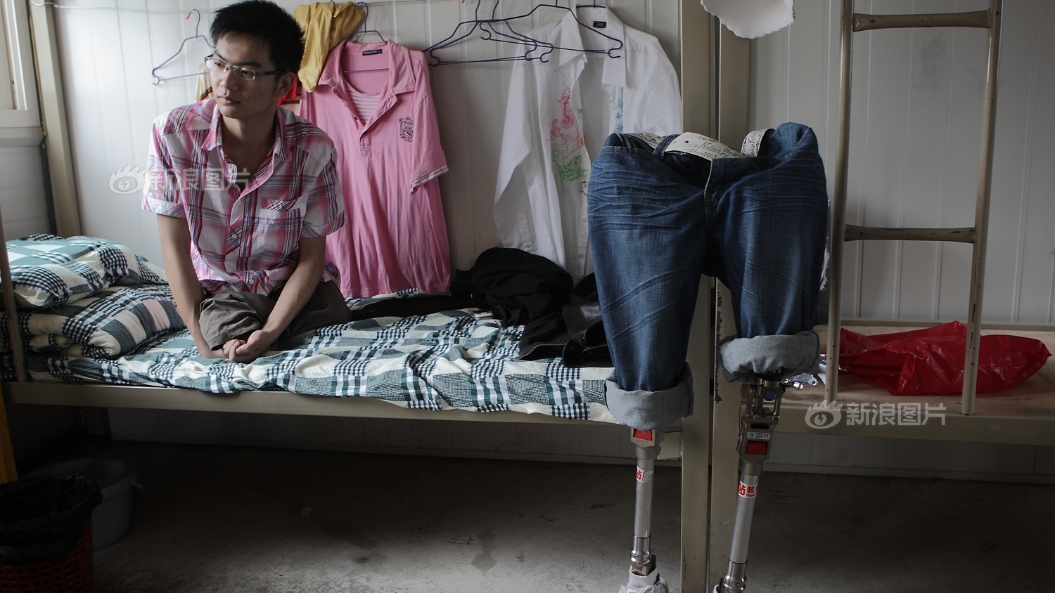 2009年5月6日,快接近地震一周年的日子,海洋一家还住在临时板房里。由于截肢的位置不好,用假肢也不方便。震后的一段时间,对海洋来说并不过好过,“那段时期其实心里挺灰暗的。”学习也一直跟不上,“如果考不上大学,又不能像健康人一样外出打工,怎么办呢?”