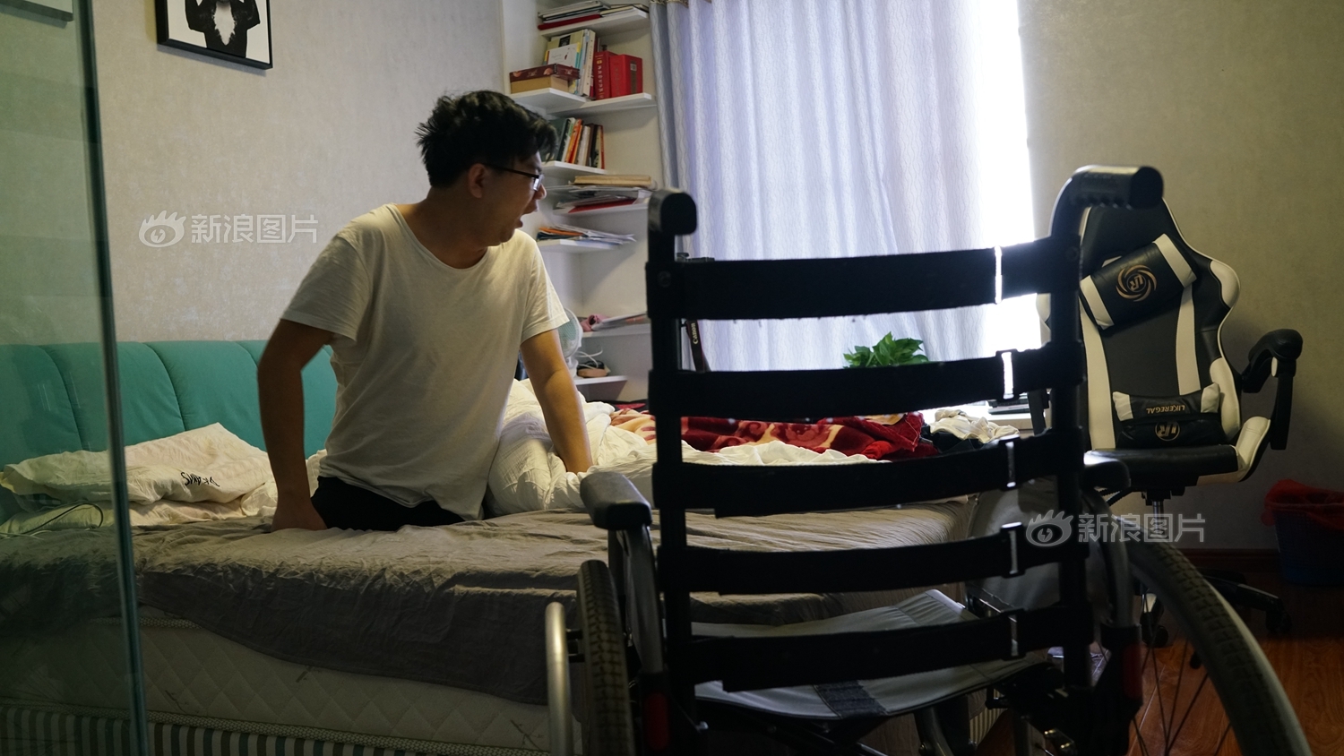 提前一天,我们就约好中午12点去他家见面。可敲门很久,都没人应答,再打电话,海洋接了“马上,马上……”门开了,他一脸睡眼惺忪。虽然坐在轮椅上,可行动却异常敏捷,双手一拨,转身,再用力一划,就已经回到了他的卧室。我甚至都还没看清他的样子。