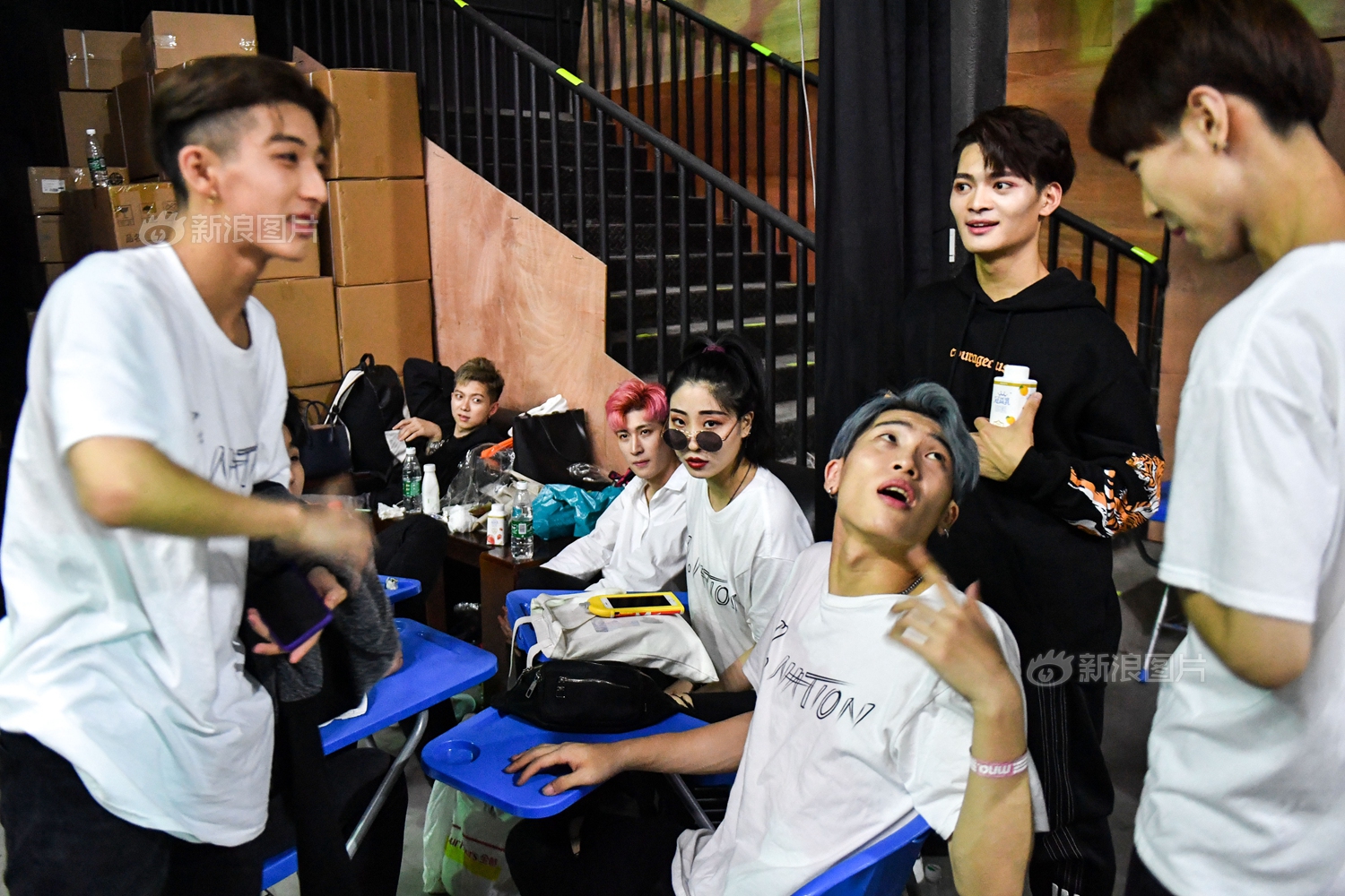 备场时,段耀奇(右一)和朋友们互相说笑。段耀奇现在的朋友大多是公司的练习生,比起在大学时,段耀奇和朋友们有更多的共同话题,一起练舞,互相鼓励,也让在北京的练习生生活没有那么枯燥。