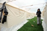 在土耳其东部凡省埃尔吉斯 一名妇女走进安置点的帐篷