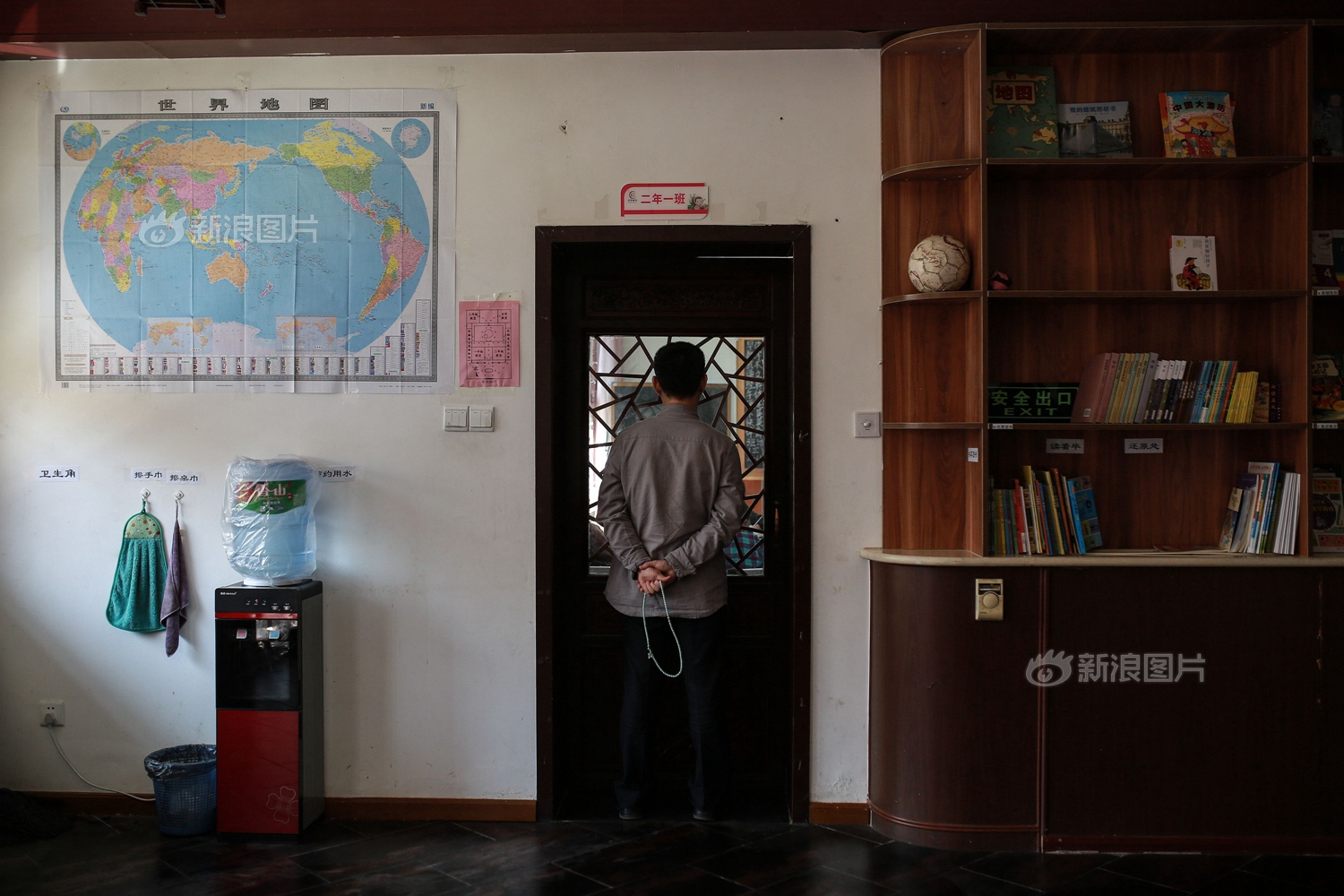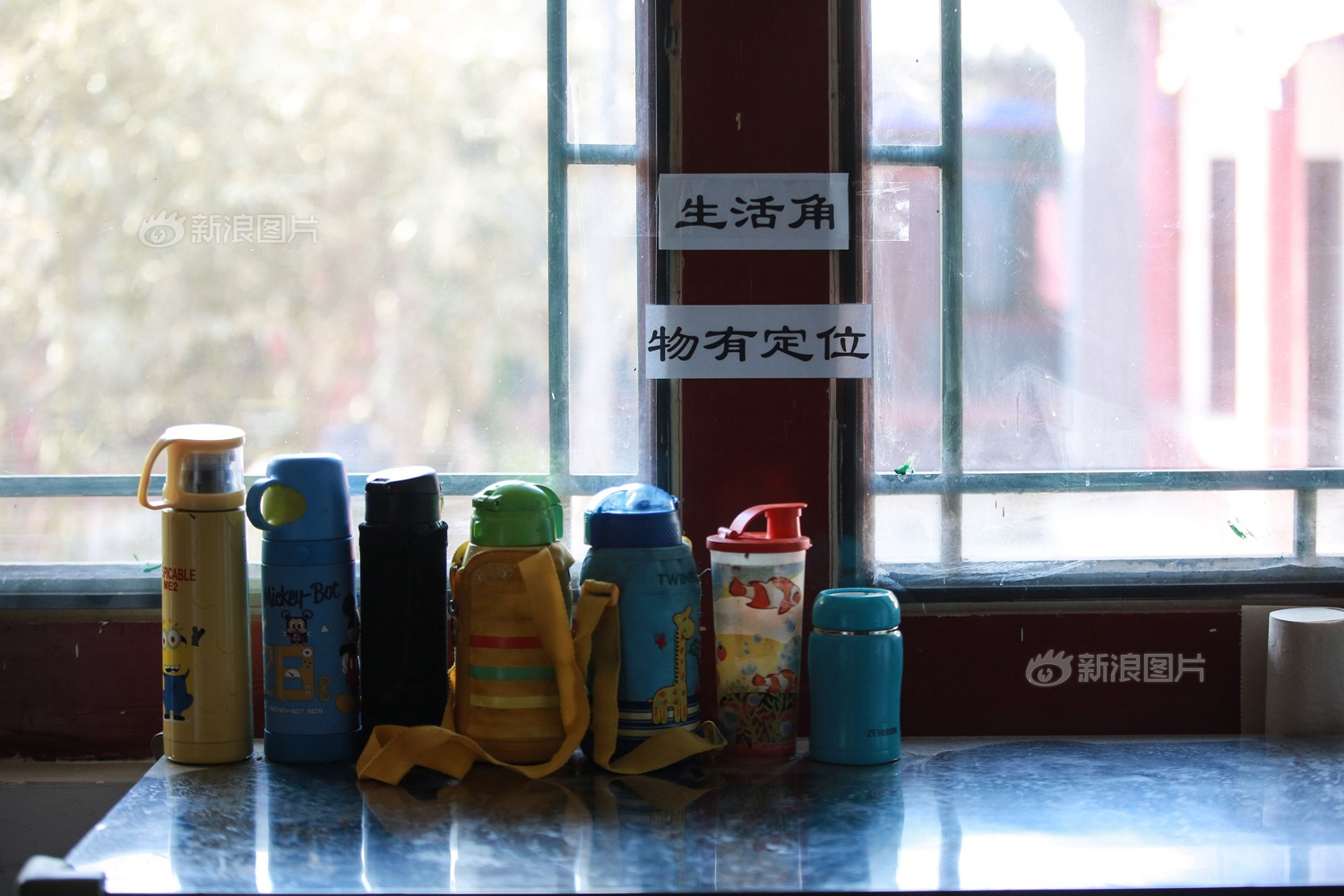 在教室一角,伦伦将自己的水杯和其他水杯整齐地摆放在一起。桌子上方纸条上写着“物有定位”,这句话源于《弟子规》中的“置冠服,有定位,勿乱顿,致污秽”,指物品要放在固定的位置,不可乱放。书院里,随处可见出自国学经典的语句。