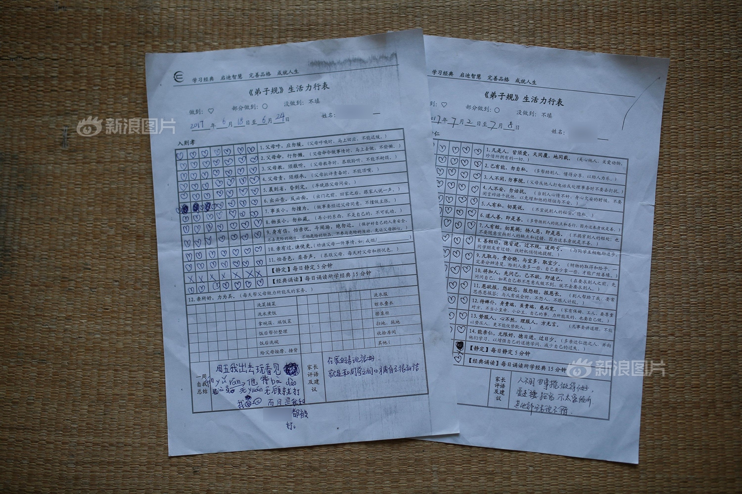 这是伦伦入学前上国学周末班时,书院发放的《弟子规》生活力行表,是用来规范和检查学生日常行为的,也是书院和家长沟通的一个渠道。伦伦刚去的第一学期不太适应,每天都哭着不想去,要转回原来的学校。伦伦妈妈本已准备转回原学校,但伦伦慢慢交了新的朋友,逐渐适应了这里,加上转回去没那么容易,后来就放弃了。