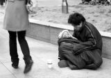一个老者带着孩子在路边乞讨